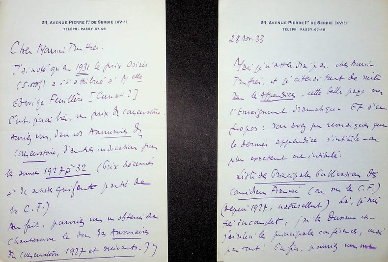 Edouard Champion (1882-1938), écrivain, libraire, éditeur. 2 L.A.S., sd & 28 novembre 1933, 4p in-8. A l'acteur Jules Truffier (1856-1943). Lettres autour de la préparation de son livre sur la Comédie française. [433]
