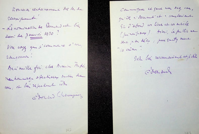 Edouard Champion (1882-1938), écrivain, libraire, éditeur. 2 L.A.S., 25 & 29 décembre 1933, 6p in-8. A l'acteur Jules Truffier (1856-1943). Belles lettres au ton amical, au moment où il relit les épreuves de son volume sur la Comédie française. Il souhaite les envoyer à Truffier pour qu'il les relit aussi. Il donne son adresse en Suisse où il part 15 jours., voeux pour la nouvelle année. Les deux feuillets de la lettre de 4p ont été collés à l'angle. [433]