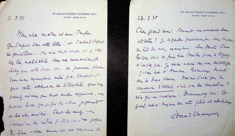 Edouard Champion (1882-1938), écrivain, libraire, éditeur. 2 L.A.S., 11 & 24 mars 1935, 3p in-4. A l'acteur Jules Truffier (1856-1943). Lettres amicales notamment pour remercier Truffier de ses lettres qu'il fera relier dans son exemplaire. [433]