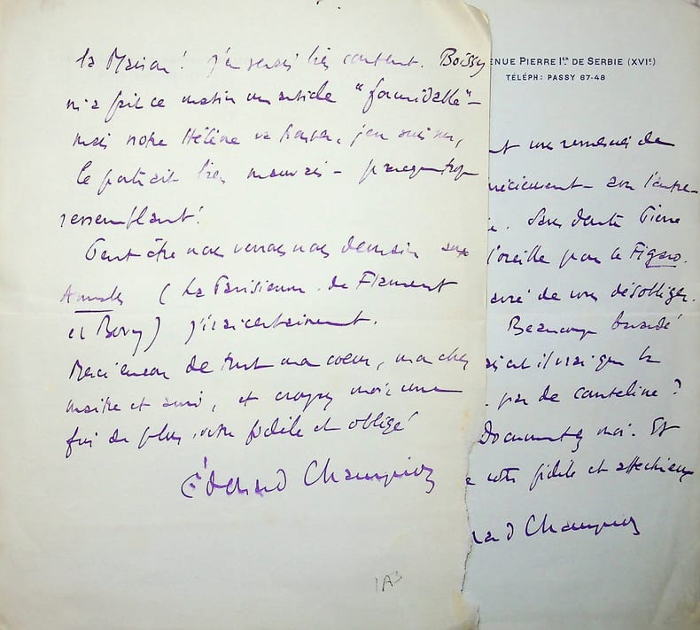Edouard Champion (1882-1938), écrivain, libraire, éditeur. 2 L.A.S., 25 & 29 décembre 1933, 6p in-8. A l'acteur Jules Truffier (1856-1943). Belles lettres au ton amical, au moment où il relit les épreuves de son volume sur la Comédie française. Il souhaite les envoyer à Truffier pour qu'il les relit aussi. Il donne son adresse en Suisse où il part 15 jours., voeux pour la nouvelle année. Les deux feuillets de la lettre de 4p ont été collés à l'angle. [433]