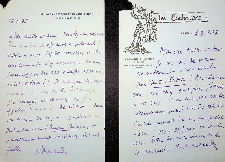 Edouard Champion (1882-1938), écrivain, libraire, éditeur. 2 L.A.S., 18 janvier 1935 & 23 mars 1937, 3p in-8. A l'acteur Jules Truffier (1856-1943). Il lui envoie des épreuves et le remercie pour un article. [433]
