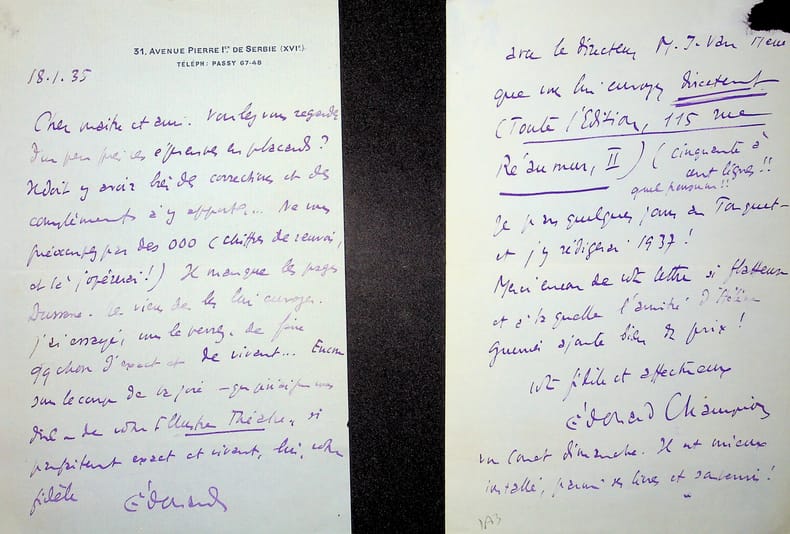 Edouard Champion (1882-1938), écrivain, libraire, éditeur. 2 L.A.S., 25 & 29 décembre 1933, 6p in-8. A l'acteur Jules Truffier (1856-1943). Belles lettres au ton amical, au moment où il relit les épreuves de son volume sur la Comédie française. Il souhaite les envoyer à Truffier pour qu'il les relit aussi. Il donne son adresse en Suisse où il part 15 jours., voeux pour la nouvelle année. Les deux feuillets de la lettre de 4p ont été collés à l'angle. [433]