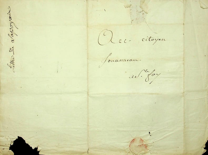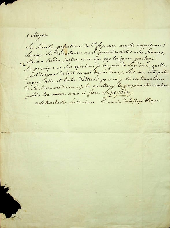 Jean de Lapoyade, dit de Tizac (1735-av.1813), officier au régiment d'Île de France. L.A.S., La Tourbeille [Juillac, Gironde], 12 nivôse an 2 [1er janvier 1794], 1/2p in-4. Belle lettre au citoyen Jouanneau, à Sainte-Foy-la-Grande : « Citoyen, La Société populaire de Sainte Foy m'a accueilli amicalement. Lorsque les circonstances m'ont permis d'assister à ses sans, elle m'a rendu justice en ce que j'ai toujours partagé. Ses principes et son opinion, je te prie de lui dire, qu'elle peut disposer de tout ce qui dépend de moi, sois mon interprète auprès d'elle et tâche d'obtenir pour moi la continuation de sa bienveillance, je la mériterai, tu peux en être caution. Je suis ton ami et ton frère. Lapoyade ». [433]