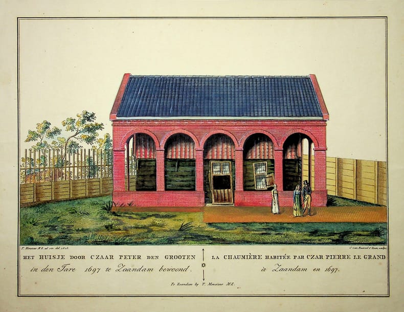 [Tsar Pierre Le Grand] Cornelis van Baarsel (1761-1826), graveur hollandais. Gravure aquarelle, 1823, environ 220*285mm. Premier état de cette gravure réalisée sur un dessin de « T. Monsieur M.Z. » éditée par ce même M.Z. Il existe un second état édité par G de Vijver. En revanche, les différents exemplaires que nous avons pu voir ont tous été aquarellés différemment. Quelques petites piqures. Peu commun. [434]