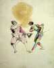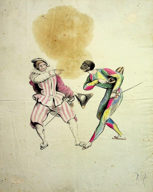 [Commedia dell arte] Dessin original. Dessin original, aquarelle, ca.1850, environ 235*185mm. Dessin anonyme de belle qualité représentant Arlequin et un autre personnage, peut-être Matamore. Tache en haut. [434]