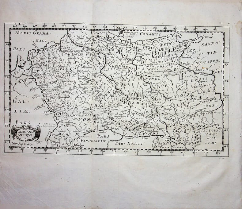 [Philippe Briet, Parallela geographiae veteris et novae] Germania Antiqua - Allemagne antique Gravure originale, 1649, environ 240*280mm. Gravure tirée de l'ouvrage du savant jésuite Philippe Briet (1601-1668) publié en 1648-1649. [435]