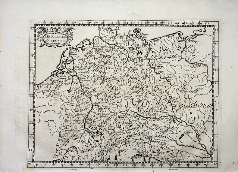 [Philippe Briet, Parallela geographiae veteris et novae] Les dix cercles d'Allemagne Gravure originale, 1649, environ 240*170mm. Gravure tirée de l'ouvrage du savant jésuite Philippe Briet (1601-1668) publié en 1648-1649. Texte au dos. [435]