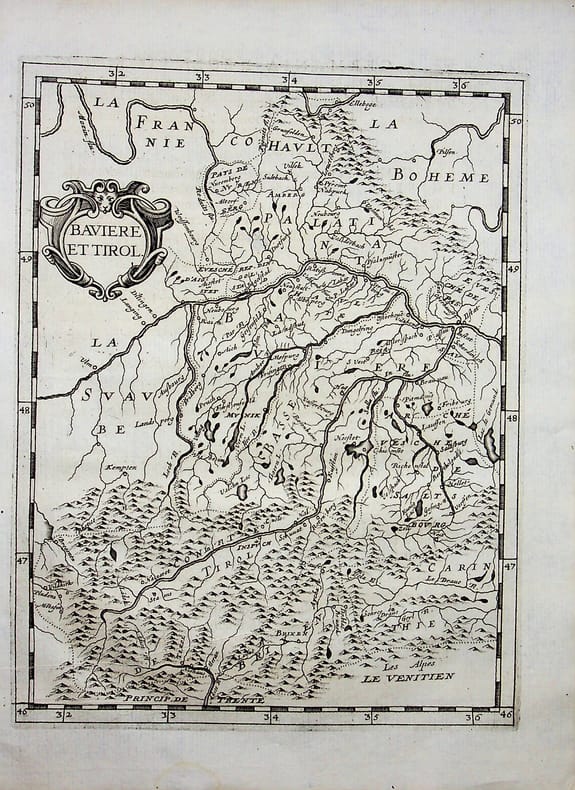 [Philippe Briet, Parallela geographiae veteris et novae] Bavière et Tirol - Allemagne et Autriche Gravure originale, 1649, environ 240*170mm. Gravure tirée de l'ouvrage du savant jésuite Philippe Briet (1601-1668) publié en 1648-1649. Texte au dos. [435]