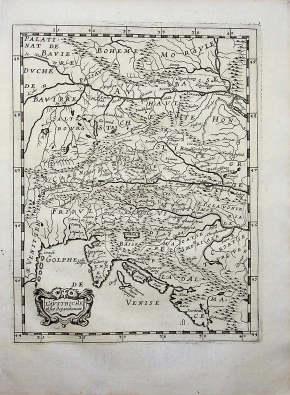 [Philippe Briet, Parallela geographiae veteris et novae] L'Austriche et ses dépendances - Autriche Gravure originale, 1649, environ 240*170mm. Gravure tirée de l'ouvrage du savant jésuite Philippe Briet (1601-1668) publié en 1648-1649. Texte au dos. [435]
