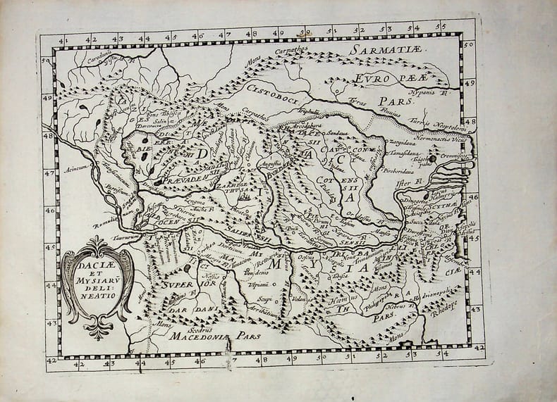 [Philippe Briet, Parallela geographiae veteris et novae] DAciae et Mysiaru delineatio - Roumanie, Moldavie. Gravure originale, 1649, environ 240*170mm. Gravure tirée de l'ouvrage du savant jésuite Philippe Briet (1601-1668) publié en 1648-1649. Texte au dos. [435]