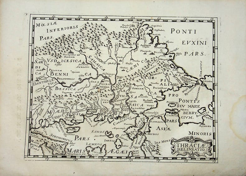 [Philippe Briet, Parallela geographiae veteris et novae] Thraciae delineatio - Grèce. Gravure originale, 1649, environ 240*170mm. Gravure tirée de l'ouvrage du savant jésuite Philippe Briet (1601-1668) publié en 1648-1649. Texte au dos. [436]