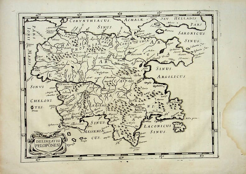 [Philippe Briet, Parallela geographiae veteris et novae] Delineatio Peloponesi - Grèce. Gravure originale, 1649, environ 240*170mm. Gravure tirée de l'ouvrage du savant jésuite Philippe Briet (1601-1668) publié en 1648-1649. Texte au dos. [436]