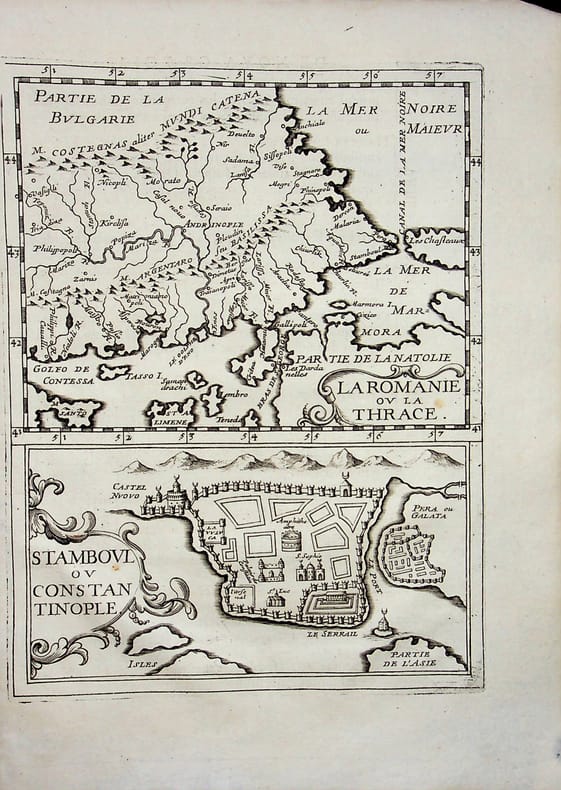 [Philippe Briet, Parallela geographiae veteris et novae] La Romanie ou la Thrace - Stamboul ou Constantinople - Grèce et Turquie. Gravure originale, 1649, environ 240*170mm. Gravure tirée de l'ouvrage du savant jésuite Philippe Briet (1601-1668) publié en 1648-1649. Texte au dos. [436]