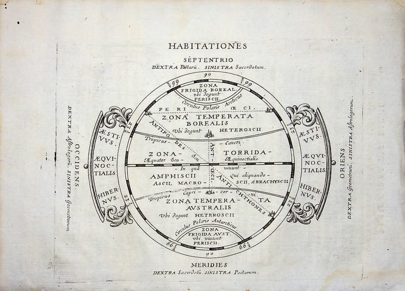 [Philippe Briet, Parallela geographiae veteris et novae] Habitationes - Différentes zone du globe. Gravure originale, 1649, environ 240*170mm. Gravure tirée de l'ouvrage du savant jésuite Philippe Briet (1601-1668) publié en 1648-1649. Texte au dos. [436]