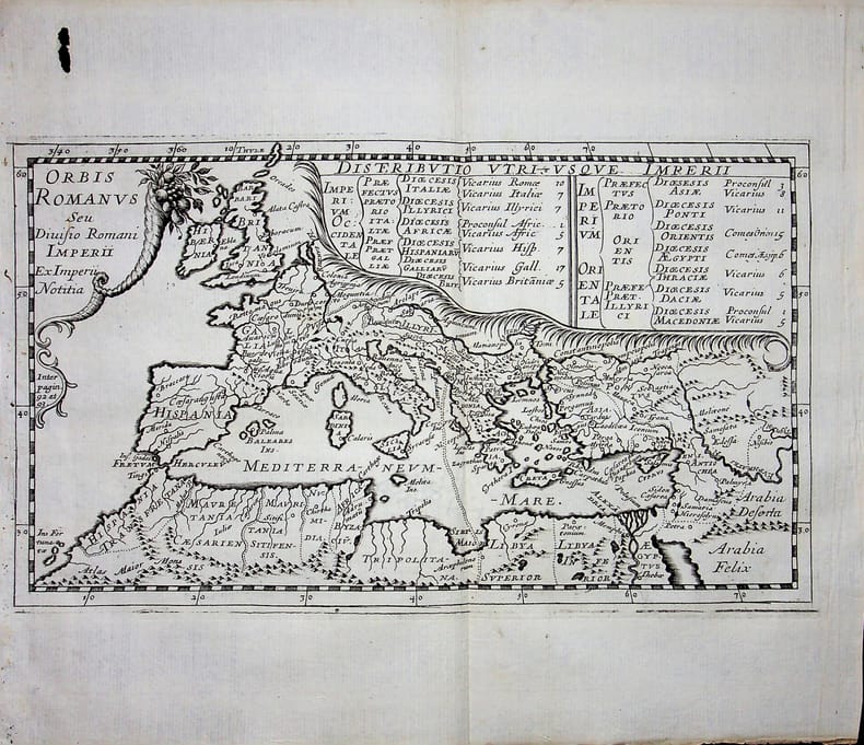 [Philippe Briet, Parallela geographiae veteris et novae] Orbis romanus seu divisio romani imperii ex imperii notitia - l'empire romain. Gravure originale, 1649, environ 240*270mm. Gravure tirée de l'ouvrage du savant jésuite Philippe Briet (1601-1668) publié en 1648-1649. Texte au dos. [436]
