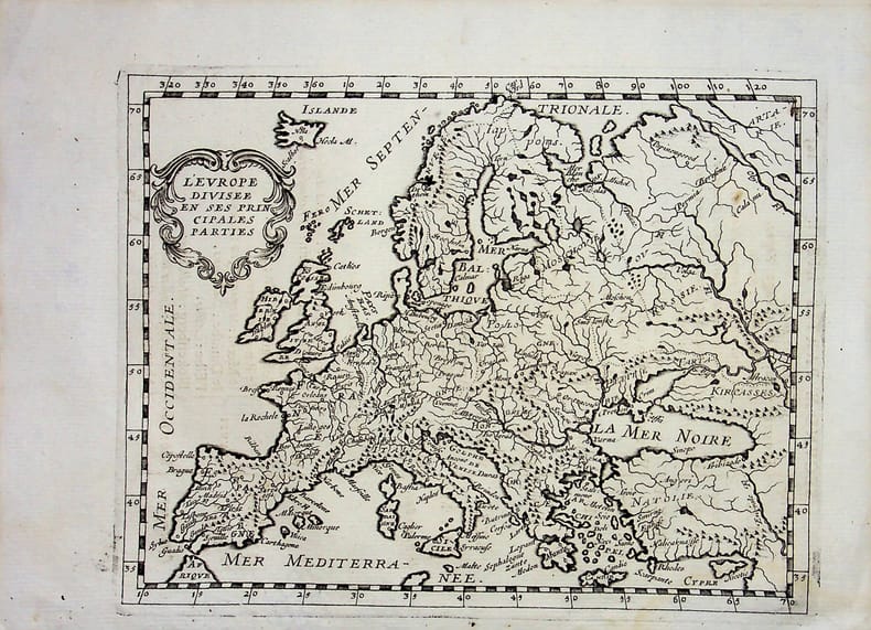 [Philippe Briet, Parallela geographiae veteris et novae] L'Europe divisée en ses principales parties. Gravure originale, 1649, environ 240*170mm. Gravure tirée de l'ouvrage du savant jésuite Philippe Briet (1601-1668) publié en 1648-1649. Texte au dos. [437]