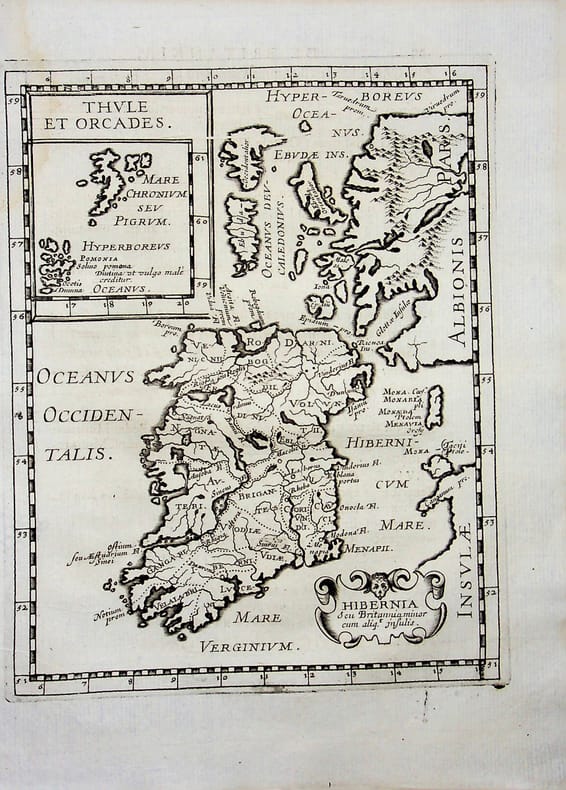 [Philippe Briet, Parallela geographiae veteris et novae] Hibernia seu Britannia minor - Irlande. Gravure originale, 1649, environ 240*170mm. Gravure tirée de l'ouvrage du savant jésuite Philippe Briet (1601-1668) publié en 1648-1649. Texte au dos. [437]