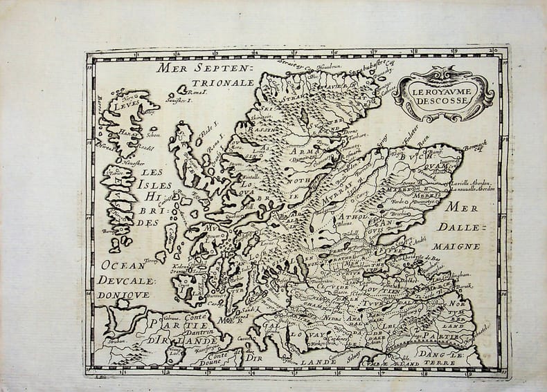 [Philippe Briet, Parallela geographiae veteris et novae] le royaume d'Ecosse. Gravure originale, 1649, environ 240*170mm. Gravure tirée de l'ouvrage du savant jésuite Philippe Briet (1601-1668) publié en 1648-1649. Texte au dos. [437]