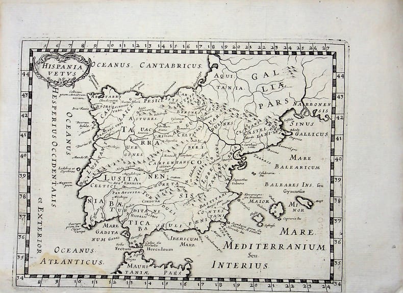 [Philippe Briet, Parallela geographiae veteris et novae] Hispania Vetus - Espagne ancienne. Gravure originale, 1649, environ 240*170mm. Gravure tirée de l'ouvrage du savant jésuite Philippe Briet (1601-1668) publié en 1648-1649. Texte au dos. [437]