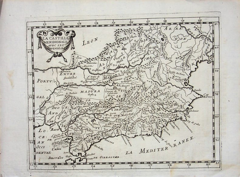 [Philippe Briet, Parallela geographiae veteris et novae] La Castille méridionale avec ses dépendances - Espagne. Gravure originale, 1649, environ 240*170mm. Gravure tirée de l'ouvrage du savant jésuite Philippe Briet (1601-1668) publié en 1648-1649. Texte au dos. [437]