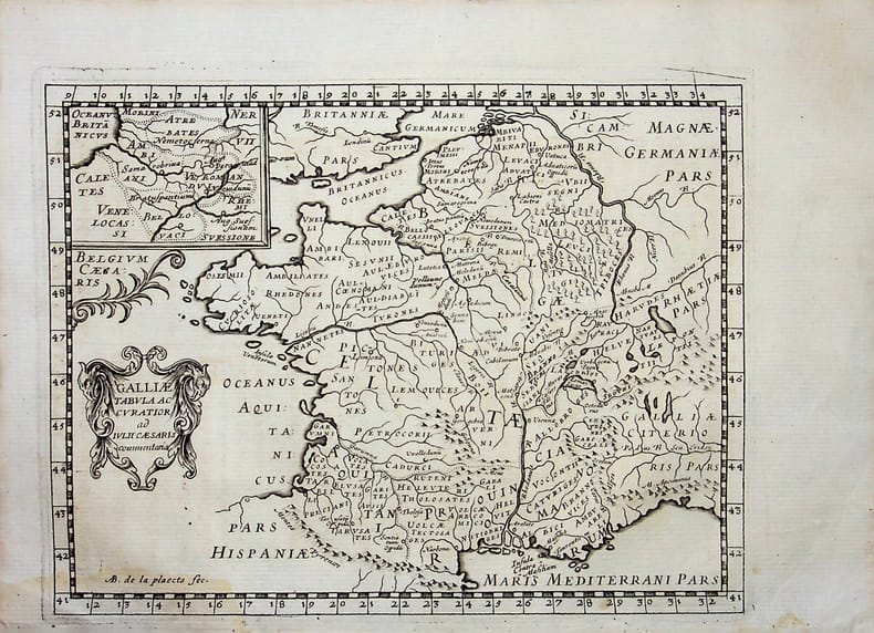 [Philippe Briet, Parallela geographiae veteris et novae] Galliae tabula ac curator ad iulii caesaris commentaria - La Gaule, France. Gravure originale, 1649, environ 240*170mm. Gravure tirée de l'ouvrage du savant jésuite Philippe Briet (1601-1668) publié en 1648-1649. Texte au dos. [437]