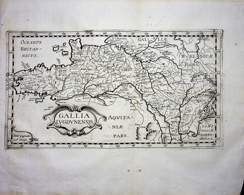 [Philippe Briet, Parallela geographiae veteris et novae] Gallia Lugdunensis - France, Gaule de Lyon à la Bretagne. Gravure originale, 1649, environ 240*305mm. Gravure tirée de l'ouvrage du savant jésuite Philippe Briet (1601-1668) publié en 1648-1649. Texte au dos. [438]