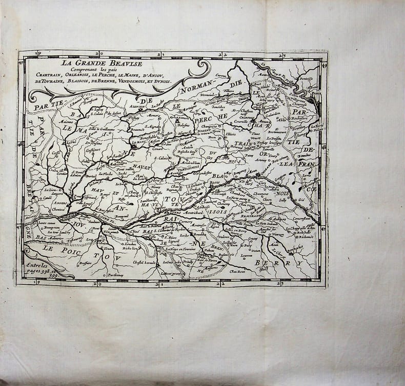 [Philippe Briet, Parallela geographiae veteris et novae] Normandie, Bretagne, Anjou, Touraine, Poitou. Gravure originale, 1649, environ 240*240mm. Gravure tirée de l'ouvrage du savant jésuite Philippe Briet (1601-1668) publié en 1648-1649. Texte au dos. [438]