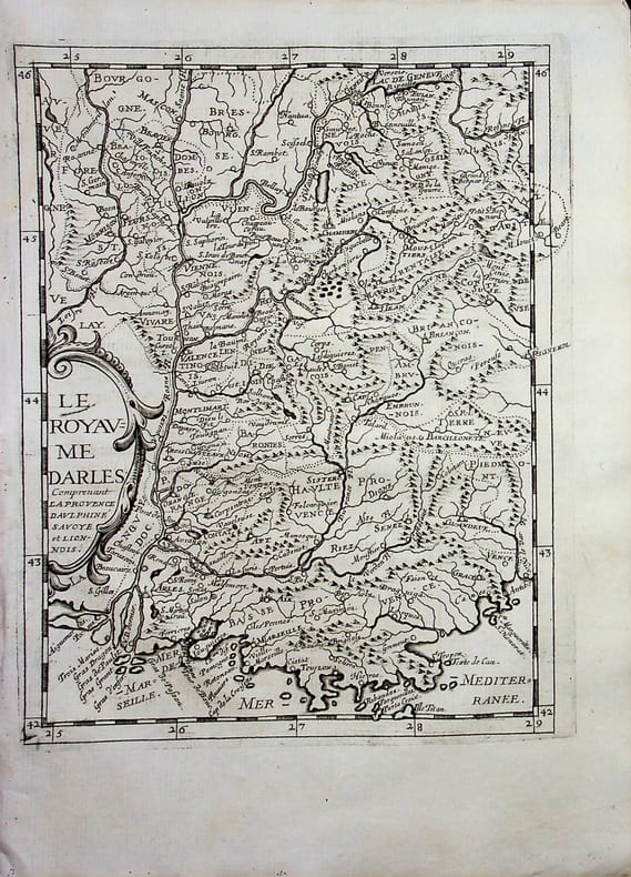 [Philippe Briet, Parallela geographiae veteris et novae] le royaume d'Arles, Provence, Dauphiné, Savoie, lyonnais. Gravure originale, 1649, environ 240*170mm. Gravure tirée de l'ouvrage du savant jésuite Philippe Briet (1601-1668) publié en 1648-1649. Texte au dos. [438]