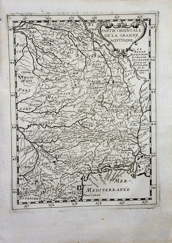 [Philippe Briet, Parallela geographiae veteris et novae] partie orientale de la grande Aquitaine. Gravure originale, 1649, environ 240*170mm. Gravure tirée de l'ouvrage du savant jésuite Philippe Briet (1601-1668) publié en 1648-1649. Texte au dos. [438]