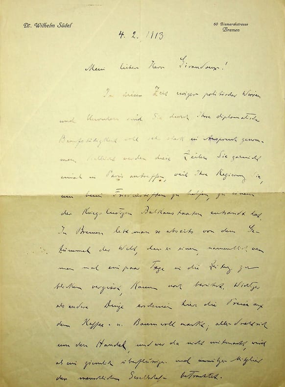Wilhelm Karl Südel (1872-1926), poète allemand, écrivain, traducteur. L.A.S., Bremen [Brême], 4 février 1913, 3p in-4. A l'écrivain Jean Giraudoux (1882-1944). Longue et intéressante lettre en allemand dans laquelle il oppose l'agitation parisienne au calme de Brême, il annonce la fin de sa traduction des oeuvres de Charles-Louis Philippe, propose à Giraudoux de traduire son Ecole des indifférents, se remémore ses visites chez Giraudoux et annonce revenir à Paris, et prend des nouvelles du roman en cours d'écriture. Jolie lettre. [439]