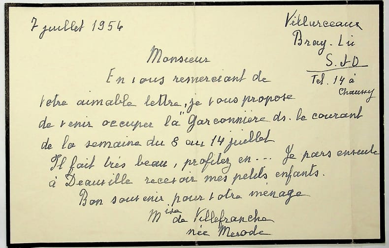 Théoduline de Mérode (1885-1962), princesse de Mérode, comtesse du Saint-Empire, par mariage marquise de Tulle de Villefranche. L.A.S., 7 juillet 1956, 1p in-8 oblong. Au peintre Paul-Adrien Bouroux (1878-1967). Elle l'invite une semaine à Villarceaux. [439]