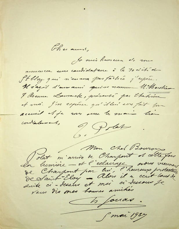 Tigrane Polat (1874-1950), peintre, graveur franco-égyptien ; Charles Jouas (1866-1942), peintre, illustrateur. L.A.S. écrite par les deux artistes, 5 mai 1937, 1p in-4. Au peintre Paul-Adrien Bouroux (1878-1967).Polat lui annonce la candidature de Charles Jouas à la société de Saint Eloy, présentée par Edgar Chahine et lui-même. Jouas ajoute un court message, mentionnant que Polat lui apporte la lumière (celle de la société de Saint Eloy). Jolie réunion. [439]