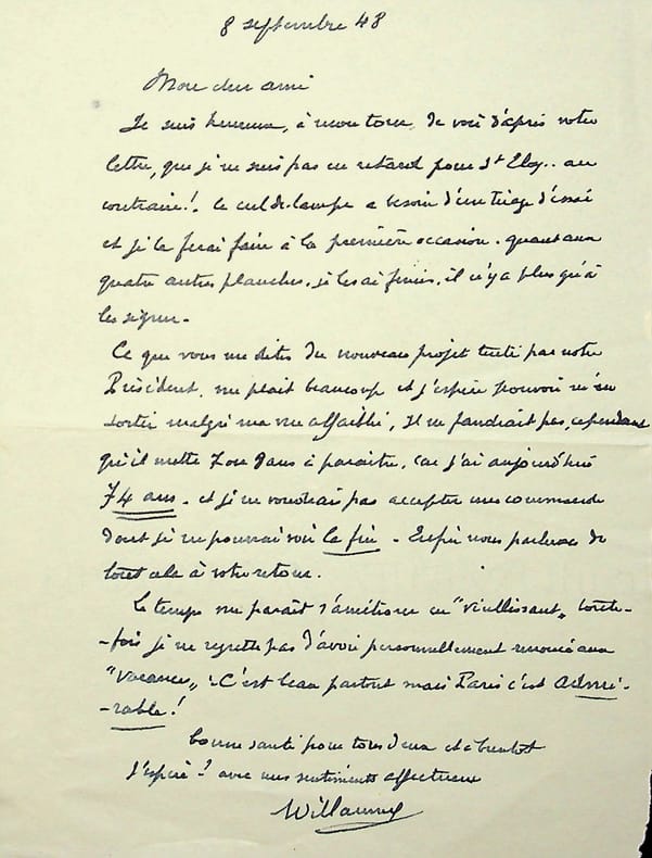 Louis Willaume (1874-1949), peintre, graveur. L.A.S., 8 septembre 1948, 1p in-8. Au peintre Paul-Adrien Bouroux (1878-1967). Longue lettre à propos d'un projet pour la Société de Saint Eloy, maison d'édition de Bouroux. [439]