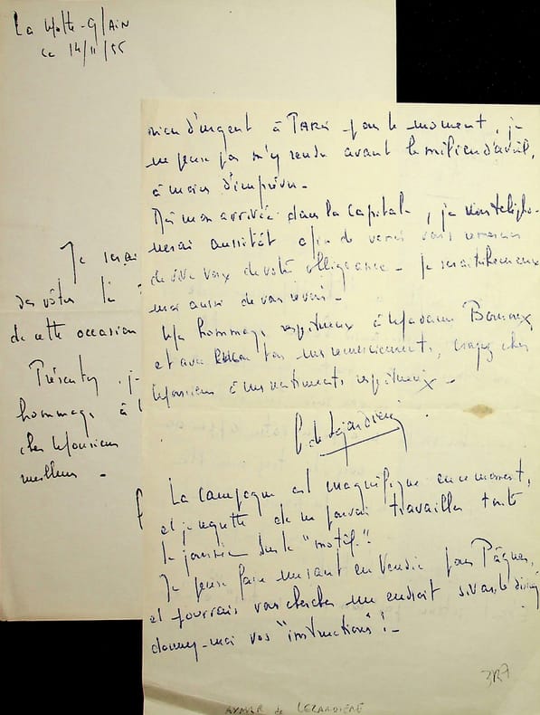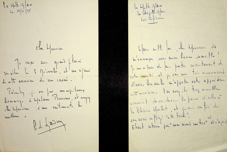 Aymar de Lézardière (1917-1995), peintre, dessinateur, graveur. 2 L.A.S., sd & 14 novembre 1955, 3p in-8. Au peintre Paul-Adrien Bouroux (1878-1967). Lettres amicales, il aimerait travailler « sur le motif » mais a deux métiers. [439]