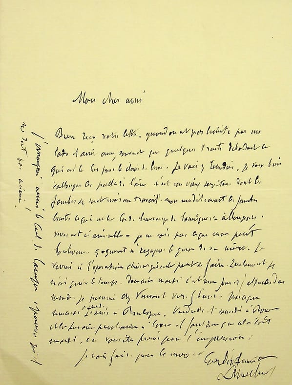 Pierre-Georges Jeanniot (1848-1934), peintre, graveur. L.A.S., 26 mai 1931, 2p in-8. Au peintre Paul-Adrien Bouroux (1878-1967). « Cher monsieur Bouroux, J'ai mis bien du temps à vous répondre, excusez-moi ! Comme vous l'avez appris, mon beau-frère Florent Scheving est mort ! Je dois vous prier d'excuser l'absence de lettre de faire-part. Son beau-fils André Camoin qui était chargé de ce soin n'a pas dû trouver les renseignements nécessaires. Comme j'étais moi-même assez mal en point, il m'a été impossible de sortir. Florent était un saint. Madame Jeanniot a assisté à ses derniers moments. Pas une plainte, il avait toute la présence d'esprit, des recommandation qui n'ont pas eu une seule fois trait à lui et cela pendant tout le temps que le mal a mis à le détruire ! J'ai toutes nos excuses à vous faire au sujet de la lettre de faire-part. Relativement à la Forêt, je vais m'y mettre aussitôt que j'aurai terminé, ce qui ne saurait tarder, un livre que je fais sur Degas qui fut pour moi un ami excellent. J'avais fait sa connaissance chez le comte Lepic en 1881. Grand artiste, énorme savoir, aussi difficile pour lui qu'une quantité de peintres le sont pour les autres. Il était avec cela la bonté même pour ses amis. Je trouve les dimensions des illustrations de la Forêt bien petites ! Surtout pour la curée qui va nécessiter quelques personnages, un cerf, un cheval, des chiens. Il faudra que nous en parlions. Veuillez agréer, cher monsieur Bouroux, l'expression de mes sentiments très distingués. G Jeanniot ». Florent Scheving était docteur, André Camoin antiquaire et décorateur. La Forêt est le livre de Maurice Genevoix, Forêt voisine, que Bouroux publiera en 1931. [169]
