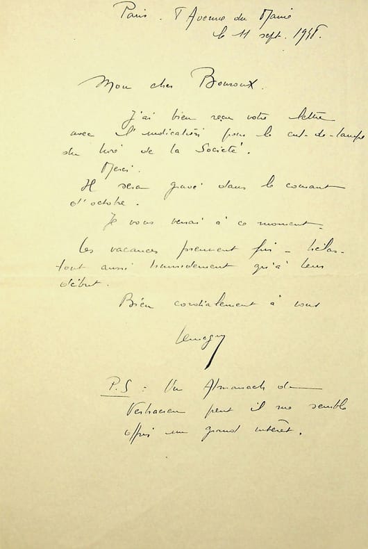 Pierre-Georges Jeanniot (1848-1934), peintre, graveur. L.A.S., 26 mai 1931, 2p in-8. Au peintre Paul-Adrien Bouroux (1878-1967). « Cher monsieur Bouroux, J'ai mis bien du temps à vous répondre, excusez-moi ! Comme vous l'avez appris, mon beau-frère Florent Scheving est mort ! Je dois vous prier d'excuser l'absence de lettre de faire-part. Son beau-fils André Camoin qui était chargé de ce soin n'a pas dû trouver les renseignements nécessaires. Comme j'étais moi-même assez mal en point, il m'a été impossible de sortir. Florent était un saint. Madame Jeanniot a assisté à ses derniers moments. Pas une plainte, il avait toute la présence d'esprit, des recommandation qui n'ont pas eu une seule fois trait à lui et cela pendant tout le temps que le mal a mis à le détruire ! J'ai toutes nos excuses à vous faire au sujet de la lettre de faire-part. Relativement à la Forêt, je vais m'y mettre aussitôt que j'aurai terminé, ce qui ne saurait tarder, un livre que je fais sur Degas qui fut pour moi un ami excellent. J'avais fait sa connaissance chez le comte Lepic en 1881. Grand artiste, énorme savoir, aussi difficile pour lui qu'une quantité de peintres le sont pour les autres. Il était avec cela la bonté même pour ses amis. Je trouve les dimensions des illustrations de la Forêt bien petites ! Surtout pour la curée qui va nécessiter quelques personnages, un cerf, un cheval, des chiens. Il faudra que nous en parlions. Veuillez agréer, cher monsieur Bouroux, l'expression de mes sentiments très distingués. G Jeanniot ». Florent Scheving était docteur, André Camoin antiquaire et décorateur. La Forêt est le livre de Maurice Genevoix, Forêt voisine, que Bouroux publiera en 1931. [169]