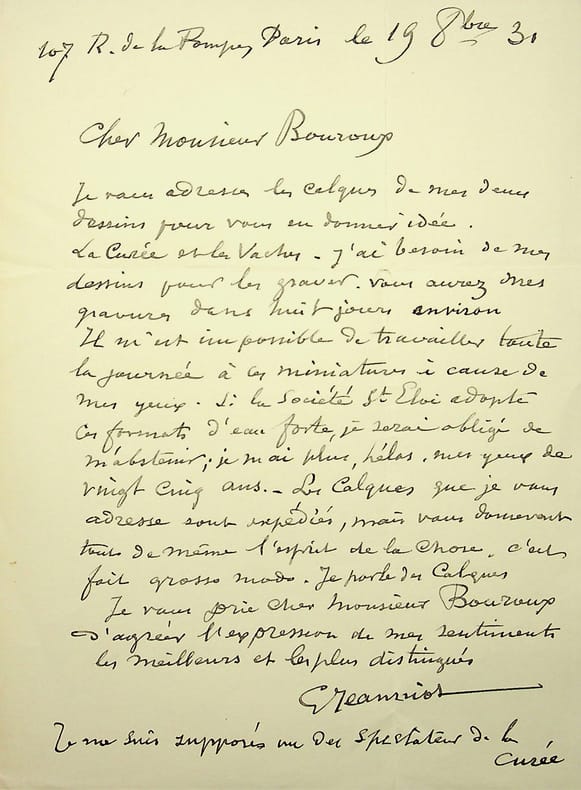 Pierre-Georges Jeanniot (1848-1934), peintre, graveur. L.A.S., 19 octobre 1931, 1p in-8. Au peintre Paul-Adrien Bouroux (1878-1967). Il envoie les calques de deux dessins, La Curée & Les Vaches, et annonce les gravures pour la semaine suivante. Il ne peut travailler toute la journée à des miniatures, « je n'ai plus, hélas, mes yeux de vingt cinq ans ». [440]