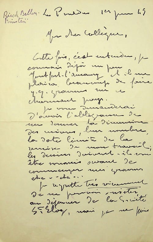 Pierre-Georges Jeanniot (1848-1934), peintre, graveur. L.A.S., 26 mai 1931, 2p in-8. Au peintre Paul-Adrien Bouroux (1878-1967). « Cher monsieur Bouroux, J'ai mis bien du temps à vous répondre, excusez-moi ! Comme vous l'avez appris, mon beau-frère Florent Scheving est mort ! Je dois vous prier d'excuser l'absence de lettre de faire-part. Son beau-fils André Camoin qui était chargé de ce soin n'a pas dû trouver les renseignements nécessaires. Comme j'étais moi-même assez mal en point, il m'a été impossible de sortir. Florent était un saint. Madame Jeanniot a assisté à ses derniers moments. Pas une plainte, il avait toute la présence d'esprit, des recommandation qui n'ont pas eu une seule fois trait à lui et cela pendant tout le temps que le mal a mis à le détruire ! J'ai toutes nos excuses à vous faire au sujet de la lettre de faire-part. Relativement à la Forêt, je vais m'y mettre aussitôt que j'aurai terminé, ce qui ne saurait tarder, un livre que je fais sur Degas qui fut pour moi un ami excellent. J'avais fait sa connaissance chez le comte Lepic en 1881. Grand artiste, énorme savoir, aussi difficile pour lui qu'une quantité de peintres le sont pour les autres. Il était avec cela la bonté même pour ses amis. Je trouve les dimensions des illustrations de la Forêt bien petites ! Surtout pour la curée qui va nécessiter quelques personnages, un cerf, un cheval, des chiens. Il faudra que nous en parlions. Veuillez agréer, cher monsieur Bouroux, l'expression de mes sentiments très distingués. G Jeanniot ». Florent Scheving était docteur, André Camoin antiquaire et décorateur. La Forêt est le livre de Maurice Genevoix, Forêt voisine, que Bouroux publiera en 1931. [169]