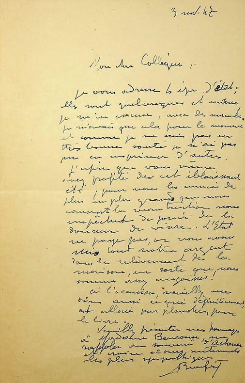 Adolphe Beaufrère (1876-1960), peintre, graveur, prix Abd-el-Tif 1911. L.A.S., 3 novembre 1947, 1p in-8. Au peintre Paul-Adrien Bouroux (1878-1967). Lettre amicale, il envoie des épreuves. [440]