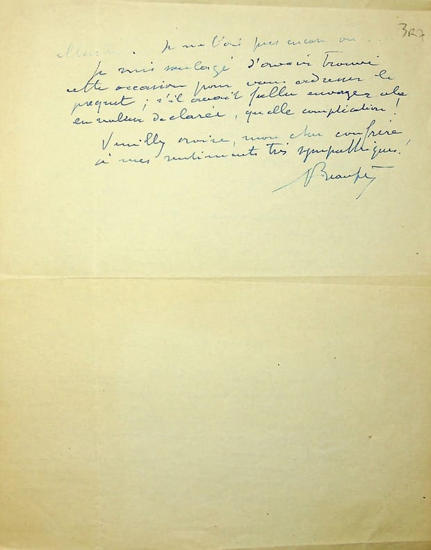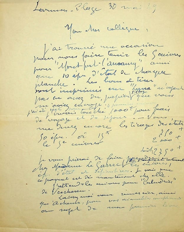 Adolphe Beaufrère (1876-1960), peintre, graveur, prix Abd-el-Tif 1911. L.A.S., Larmor-Plage, 30 mai 1949, 1p 1/2 in-4. Au peintre Paul-Adrien Bouroux (1878-1967). A propos de ses collaborations avec la Société Saint Eloy : les cuivres pour Montfort l'Amaury, et des épreuves qu'il va faire envoyer, des bons à tirer, et la somme à payer. Il atttend les cuivres pour le Verhaeren. [440]