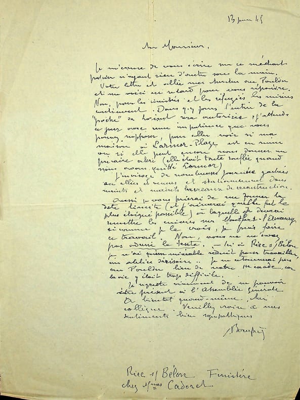 Adolphe Beaufrère (1876-1960), peintre, graveur, prix Abd-el-Tif 1911. L.A.S., 13 juin 1945, 1p in-4. Au peintre Paul-Adrien Bouroux (1878-1967). Joli lettre, il attend de pouvoir revenir dans la « poche de Lorient » et de savoir si sa maison est en ruine. Il demande la date limite pour renvoyer des cuivres de Montfort l'Amaury. [440]