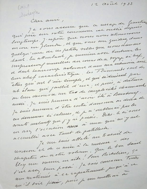 Emile Sedeyn (1871-1946), journaliste, écrivain, rédacteur en chef du Figaro illustré. L.A.S., 12 août 1933, 2p in-4. Au peintre Paul-Adrien Bouroux (1878-1967). Belle lettre amicale, se rappelant leur voyage dans les Flandres et signalant qu'il reprend ses textes pour leur projet, Petites villes de France. Il mentionne le Vivat flamand, l carillon dans la nuit, etc. [440]