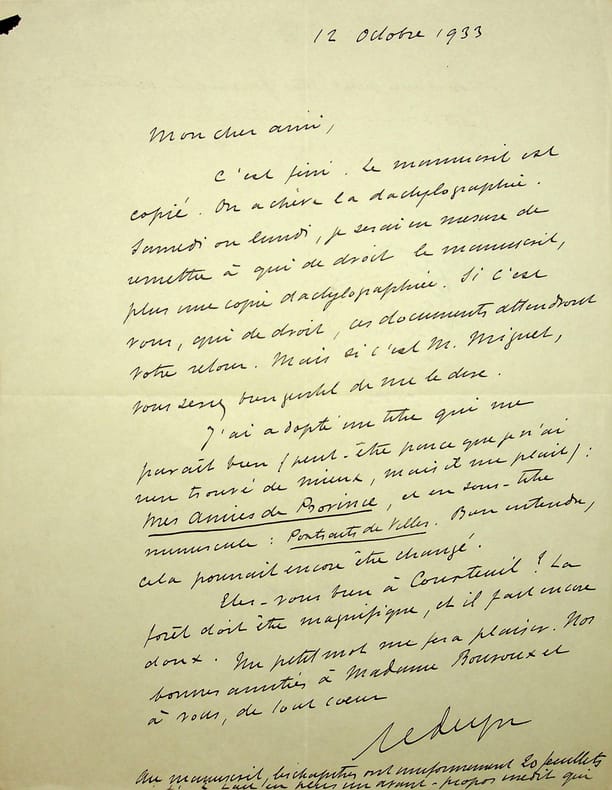 Emile Sedeyn (1871-1946), journaliste, écrivain, rédacteur en chef du Figaro illustré. L.A.S., 12 octobre 1933, 1p 1/4 in-8. Au peintre Paul-Adrien Bouroux (1878-1967). Il annonce avoir fini de copier son texte pour les Petites villes de France et le fait dactylographier. Il propose comme titre « mes amies de Province », ce qui ne sera pas choisi. [440]