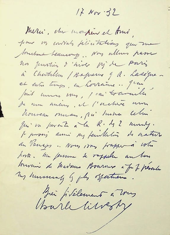 Charles Silvestre (1889-1948), écrivain. L.A.S., 17 novembre 1932, 1p in-8. Au peintre Paul-Adrien Bouroux (1878-1967). Remerciements pour des félicitations reçues pour sa Légion d'Honneur. [440]