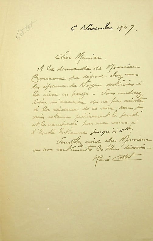 René Cottet (1902-1992), peintre, graveur. L.A.S., 6 novembre 1947, 1p in-8. Il dépose des épreuves à la demande du peintre Paul-Adrien Bouroux. [441]