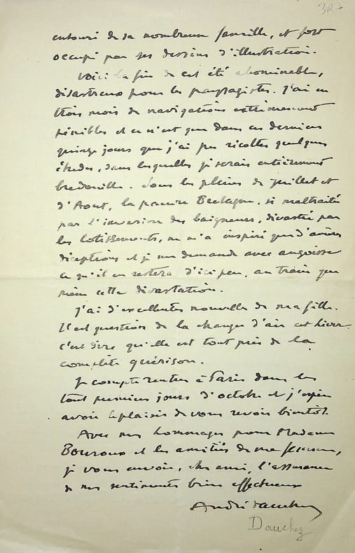 André Dauchez (1870-1948), peintre, graveur, photographie, peintre officiel de la Marine, président de la société nationale des beaux-arts. L.A.S., 24 septembre 1931, 2p in-4. Au peintre Paul-Adrien Bouroux (1878-1967). Longue et belle lettre amicale donnant des nouvelles. Il se plaint notamment de « la pauvre Bretagne, si maltraitée par l'invasion des baigneurs, dévastée par les lotissements, [qui ne lui] a inspiré que d'amères déceptions et [il] se demande avec angoisse ce qu'il en restera d'ici peu, au train que mène cette dévastation ». Peu commun. [441]