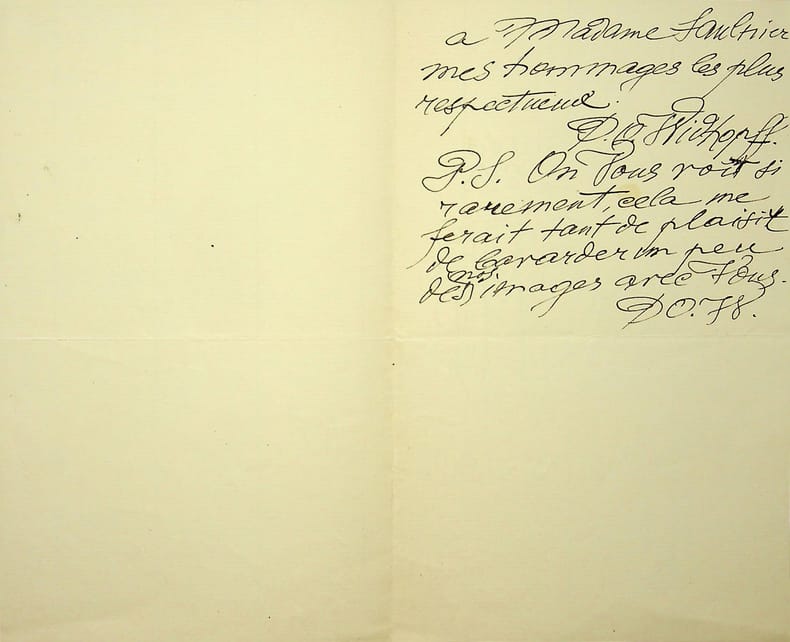 Lettre autographe signée de Félix Fénéon adressée à Gabriel Mourey, 18 lignes à l'encre noire, traces de pliure inhérentes à la mise sous pli de la lettre. Témoin et acteur privilégié de son époque, le critique d'art et collectionneur Félix Fénéon aide l'auteur Gabriel Mourey dans sa quête pourretrouver la correspondance de Paul Adam avec Maurice Barrès : "Le romancier et occultiste Paul Adam fut, comme vous savez, très lié à Maurice Barrès. (Candidats boulangistes dans deux circonscriptions lorraines contiguës, il firent fraternellement une campagne électorale et journalistique à laquelle leur amitié ne survécut guère.)Comment retrouver tous les papiers de Paul Adam, mort il y a une vingtaine d'années ? Mme Paul Adam vit-elle encore. - je n'en sais rien. Mais il est probable que vive une de ses soeurs, veuve depuis quelques trois ans de ce L. Cappielloauteur de tant d'affiches, - peintre elle aussi (et, de plus, fort sourde). Leur demeure était 8 rue Lechatelier, XVIIe. Par Mme L. Cappiello vous retrouverez peut-être des papiers barrésiens laissés par Paul Adam. Pour le cas où vous chercheriez dans cette direction, je note que que j'ai été en excellents termes avec toute la famille et que vous pouvez donc user de mon nom à votre gré." Personnalité majeure de l'Avant-garde, Fénéon avait le talent de débusquer les plus grands artistes. Cet étrange dandy volontairement discret, fit le vude servir quasi religieusement tout ce qui dans l'art forme une nouvelle sensibilité.Défenseur des néo-impressionnistes Seurat et Signac, ami de Mallarmé et de Camille Pissaro, de Paul Adam, Gustave Kahn, anarchiste puis communiste, directeur d'une douzaine de petites revues, il publia des uvres neuves telles les Illuminationsde Rimbaud, lePaludesd'André Gide,Dédalusde James Joyce. Prolifique journaliste, il écrivit partout et ne signa pas ses articles ou emprunta même des pseudonymes extravagants comme Gil de Bache, Porphyre Kalouguine, voire Thérèse ou Louise. Rare lettre de Félix Fénéon sur ses contemporains. Nous y joignions une lettre autographe signée de Fanny Fénéon, femme de Félix Fénéon, datée du 30 décembre 1941 alors que son mari était malade et alité, 10 lignes à l'encre noire, traces de pliure inhérentes à la mise sous pli de la lettre. "Mon mari gravement malade est dans l'impossibilité de recevoir quelqu'un. Si la difficultéque vous désirez lui remettre peut se résoudre par lettre, veuillez lui dire ce dont il s'agit. Une réponse immédiate vous montrera que malgré ses 80 ans, il est tout à votre disposition. [...]" - Photographies et détails sur www.Edition-Originale.com -