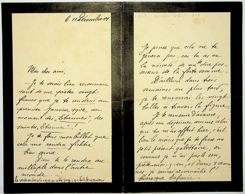 Georges Thenon dit Rip (1884-1941), chansonnier, dessinateur, écrivain. L.A.S., 11 décembre 1901, 4p in-8. Amusante lettre à un ami pour lui réclamer un prêt de 20 francs. « je suis poursuivi par une meute de créanciers. Sauve ton ami du déshonneur, et peut-être de la mort ! Car je me tuerai plutôt que d'aller sur le banc d'infamie ». Il demande la discrétion. Jolie lettre. [441]