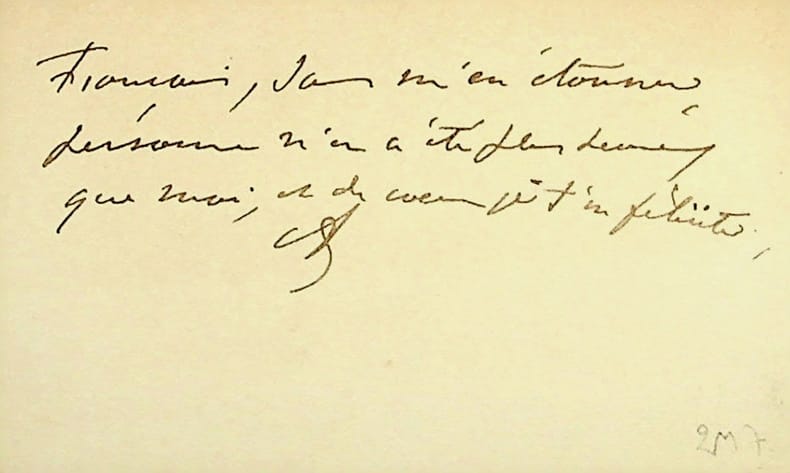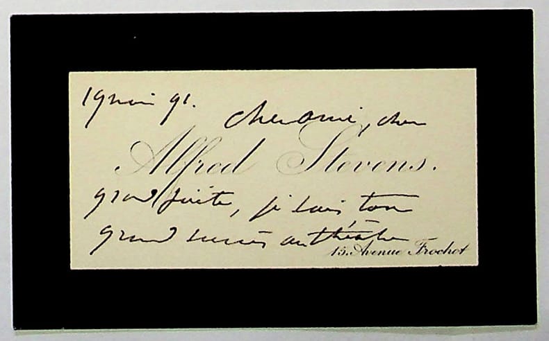 Alfred Stevens (1823-1906), peintre belge. C.A.S., 19 mai 1891, 6 lignes. Au poète Armand Silvestre (1837-1901) : « Cher ami, cher grand poëte, je sais ton grand succès au théâtre français, sans m'en étonner. Personne n'en a été plus heureux que moi, et de coeur, je t'en félicite. AS ». En effet, le 15 mai, la pièce de Silvestre et Eugène Morand, Grisélidis, fut créée avec grand succès. Elle sera mise en musique par Massenet en 1901. [442]