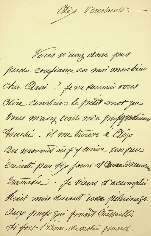 Lettre autographe signée du peintre Carolus-Duran (1837-1917), adressée à son ami Charles Dettelbach, puissant personnage siégeant au conseil d’administration de la Compagnie Minière franco-tunisienne dont l’épouse, cantatrice mondaine, tenait un salon musical et côtoyait Proust, Raynaldo Hann... Dans cette lettre Carolus s'excuse avec vivacité de ne pouvoir accepter l'invitation de son ami. Ainsi écrit-il : "voulant tâcher de me libérer. Pour cela je suis allé cet après-midi voir l'ami qui m'avait invité ; mais il m'a répondu qu'il avait invité pour moi plusieurs personnes qui viennent de Londres et qu'il se fâcherait [...] Voilà la situation [...] pour moi qui aurait été si heureux de vous dire : oui. "Pliures.